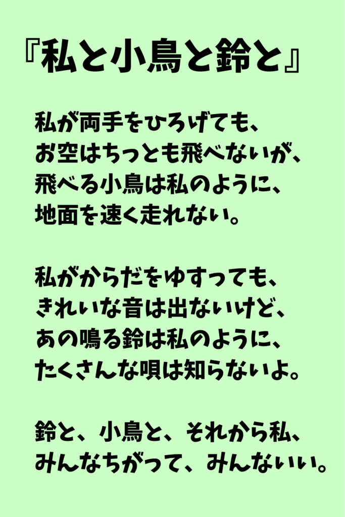 「みんなちがって、みんないい」はよく知られたフレーズですが、その一行前には「鈴と、小鳥と、それから私」と書かれています。