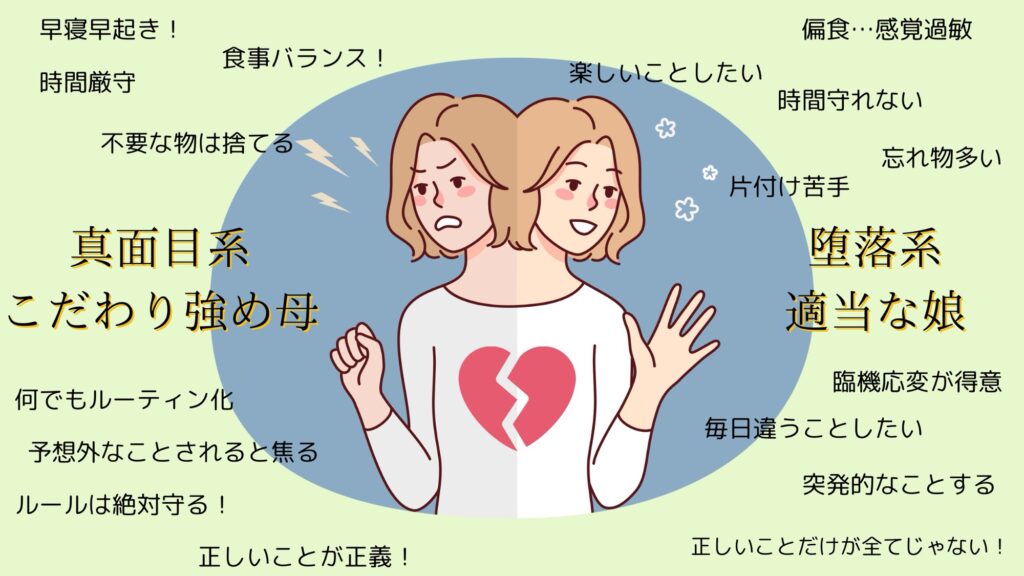 母親がこだわり強めで、常に真顔。笑顔を見たことがない。過干渉で何でも管理したがるので、家ではルールが多かった。(診断は受けていないが、自閉症特性強め)